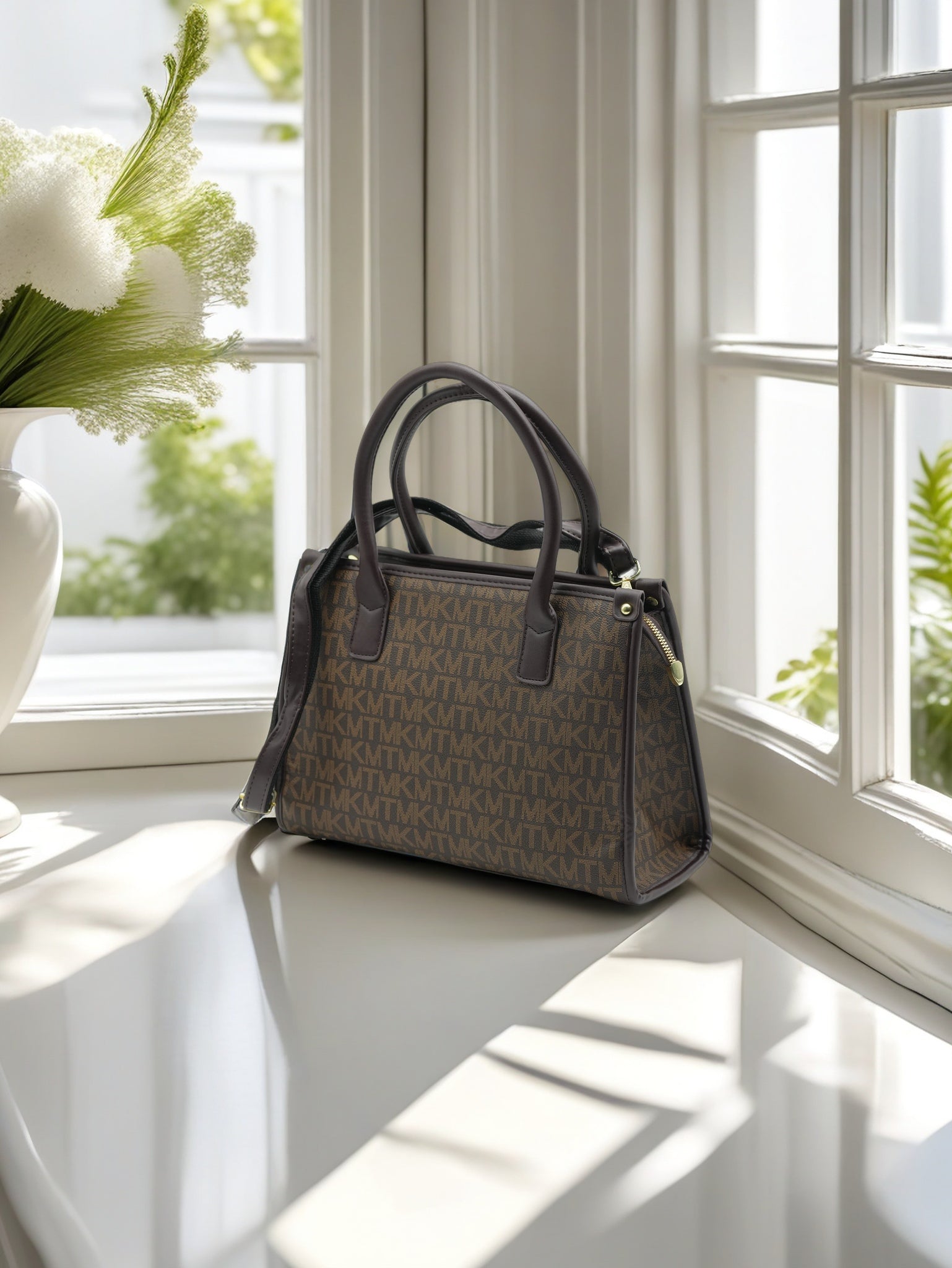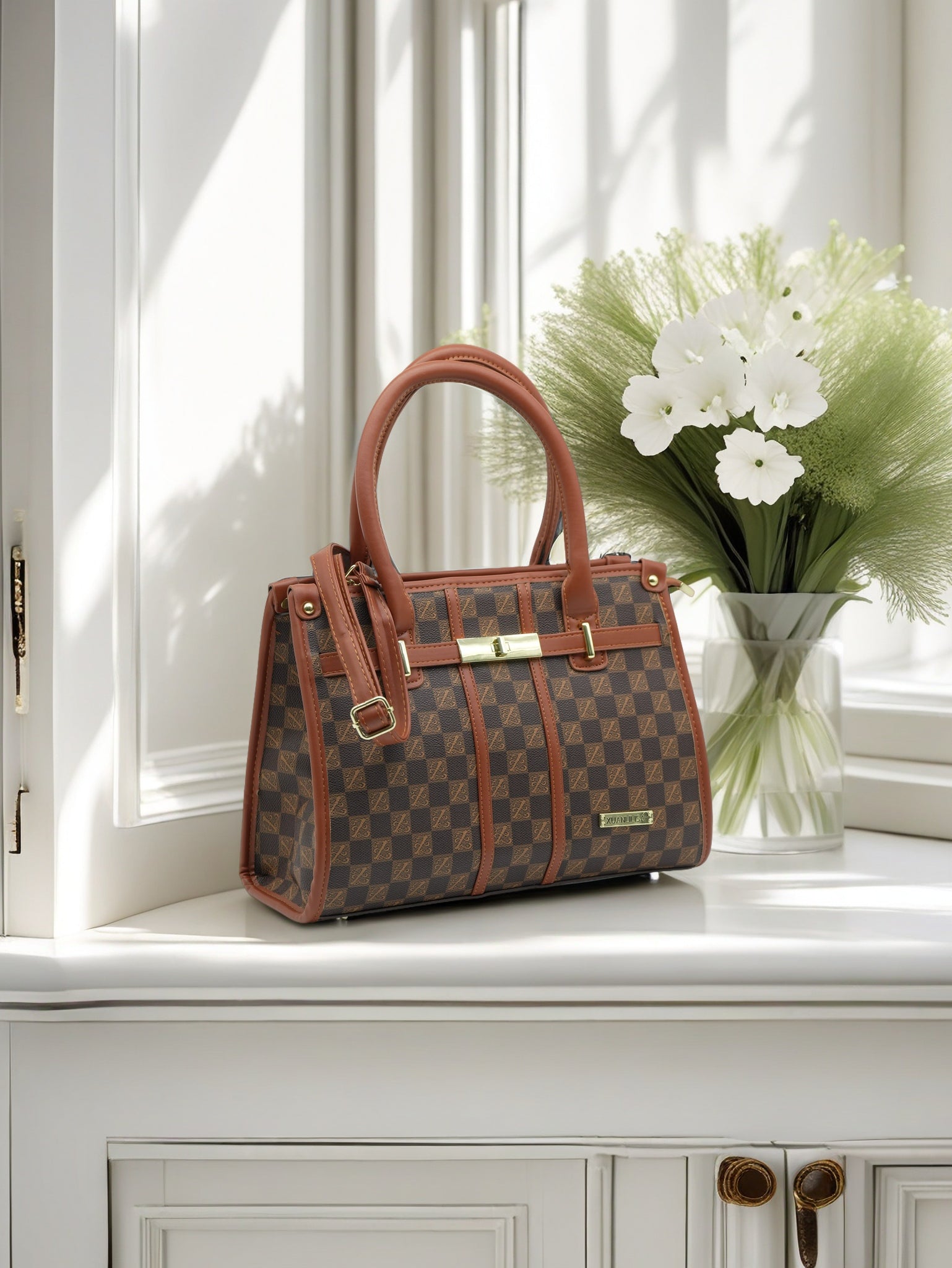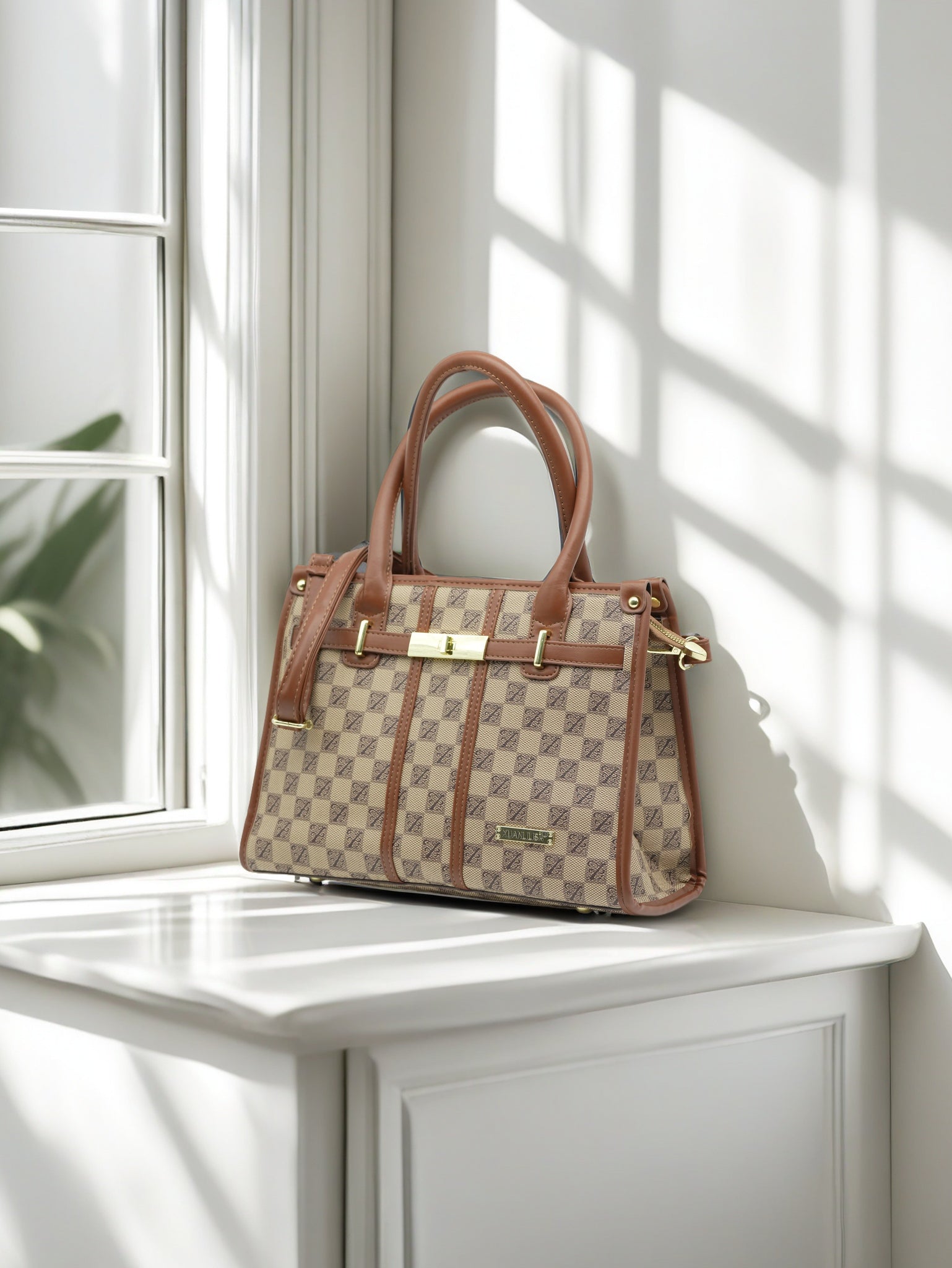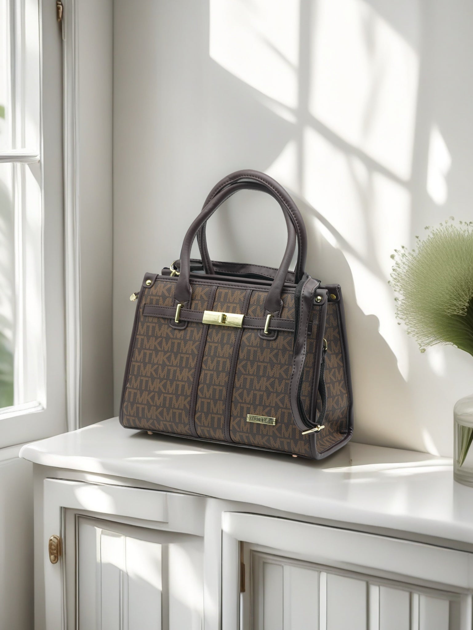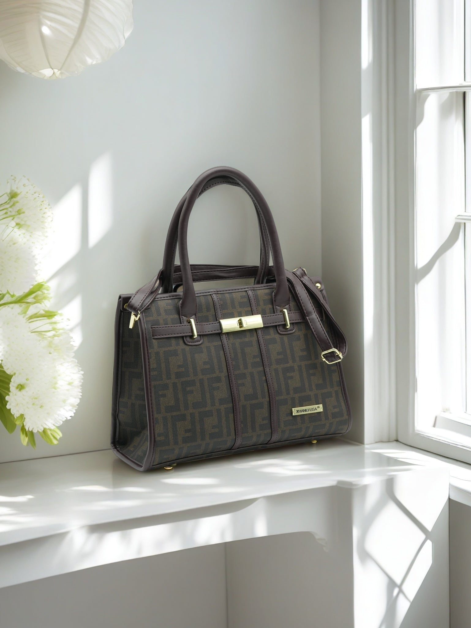 حقيبة يد نسائية بنية اللون مستوحاة من المصممين ومزينة بأحرف أولى مع قفل ذهبي ومقابض علوية