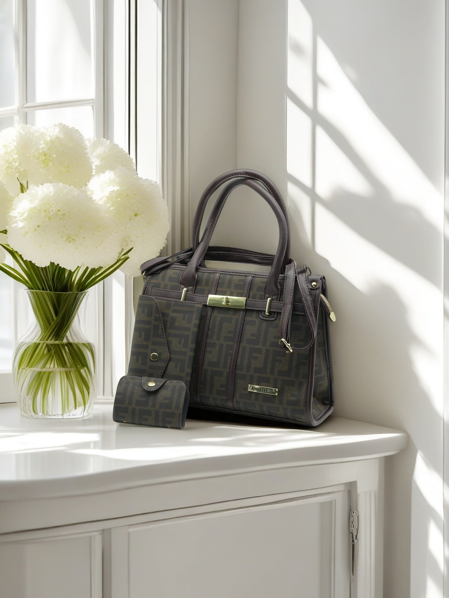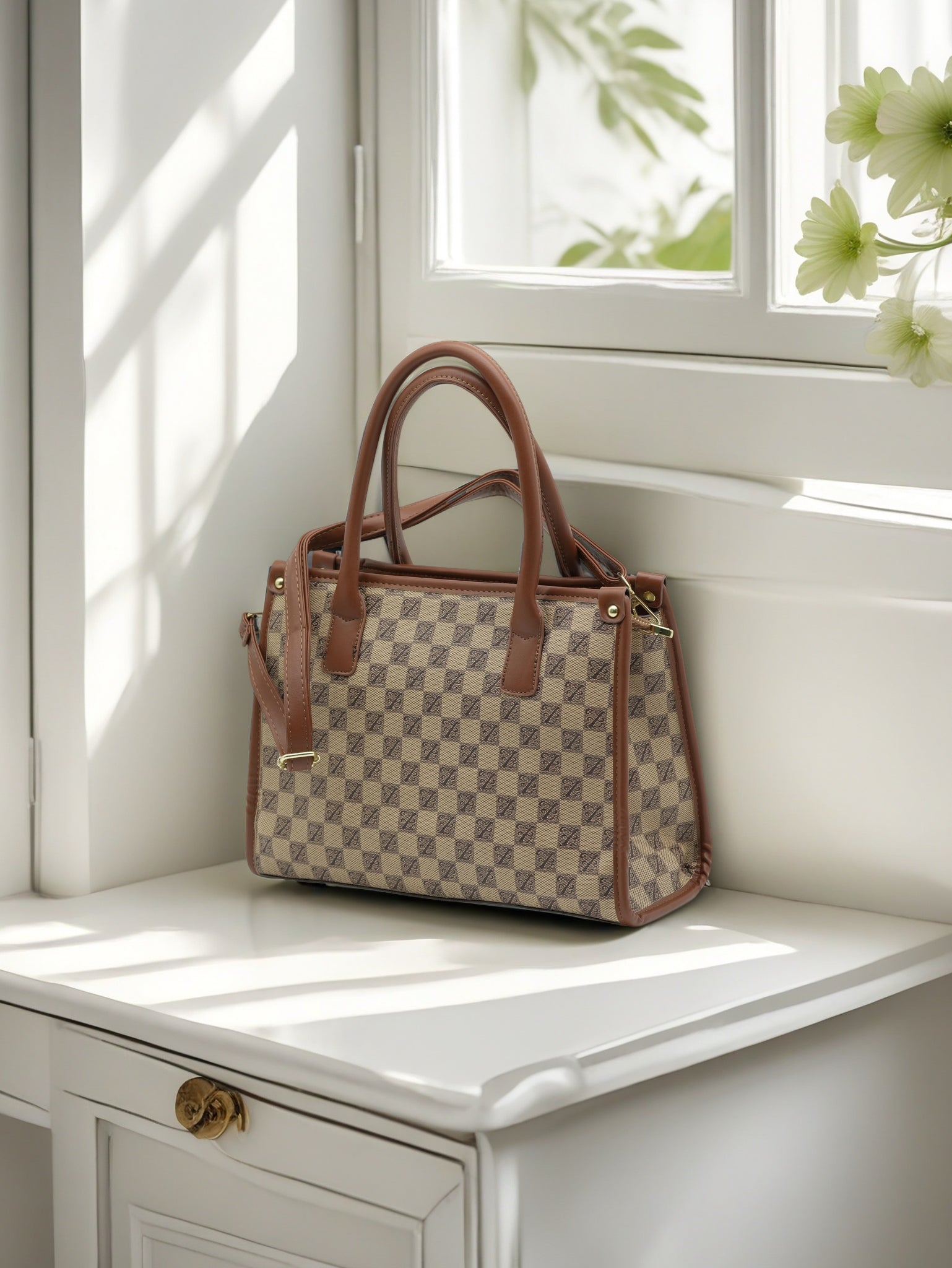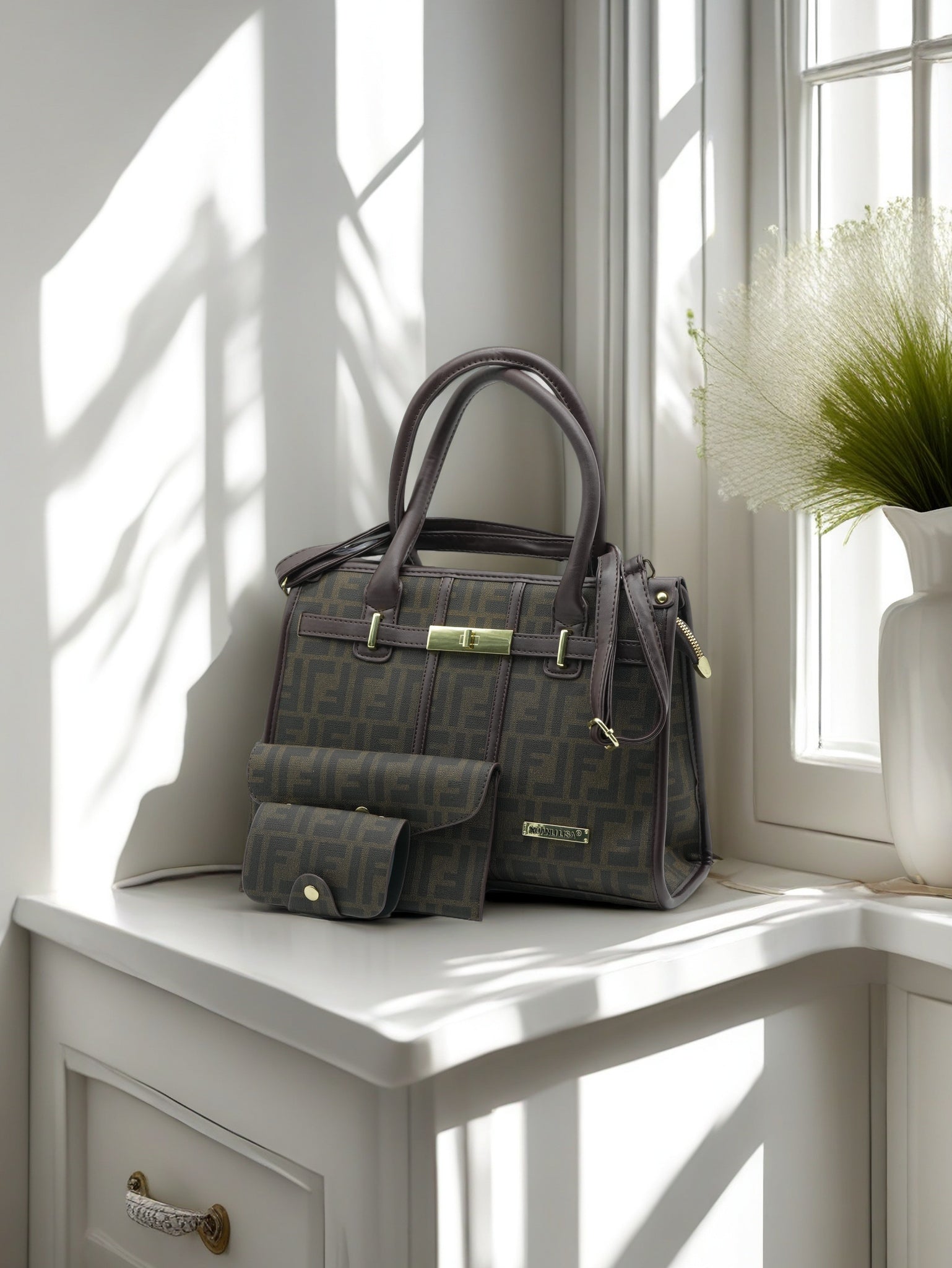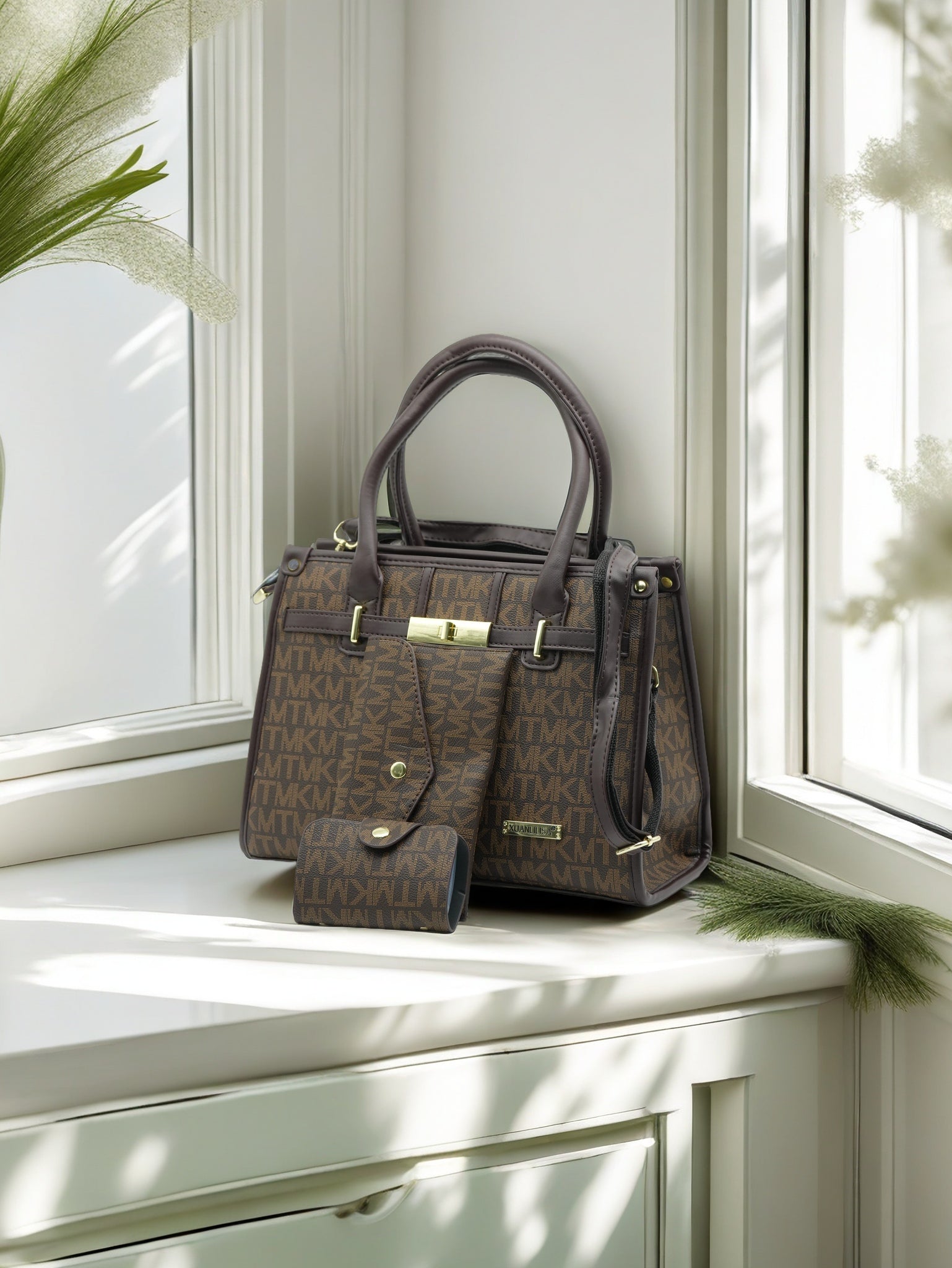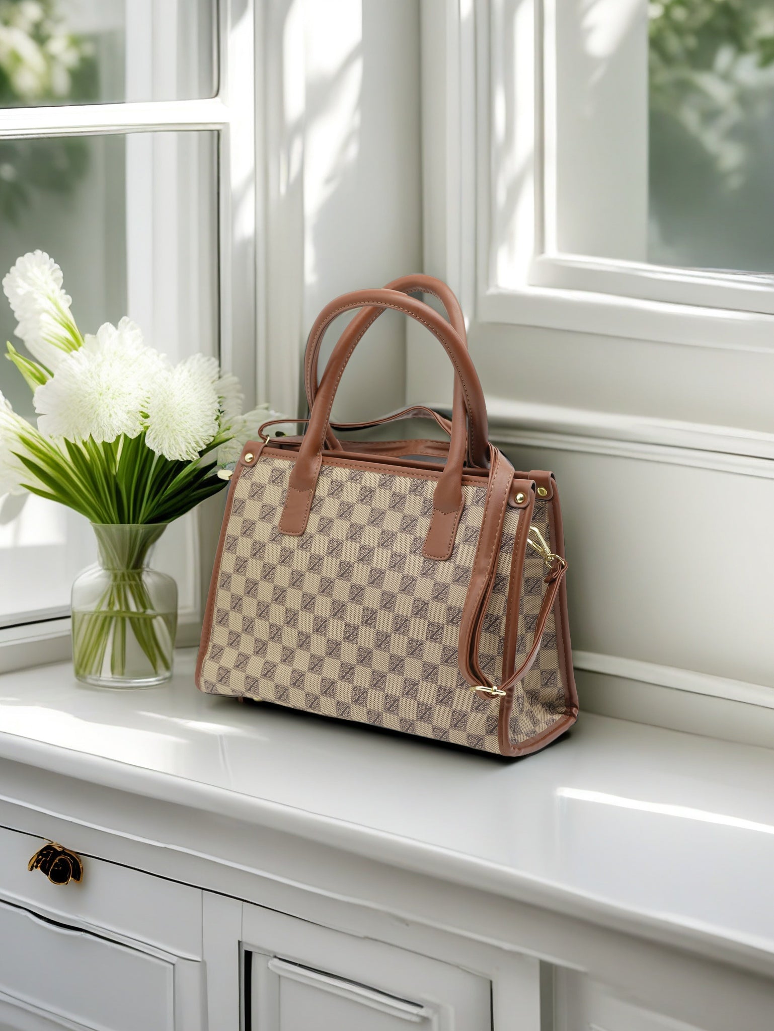 حقيبة يد نسائية بنية اللون مستوحاة من المصممين ومزينة بأحرف أولى مع قفل ذهبي ومقابض علوية