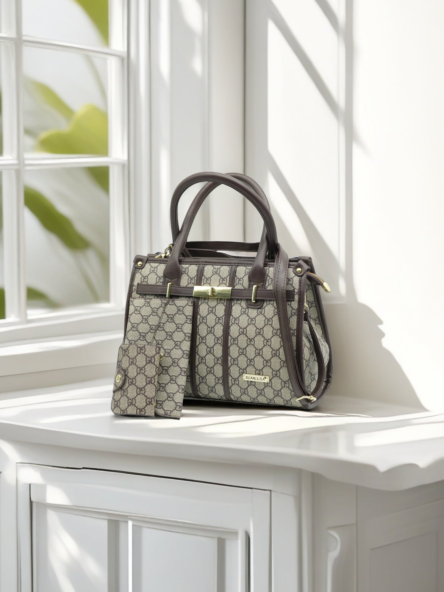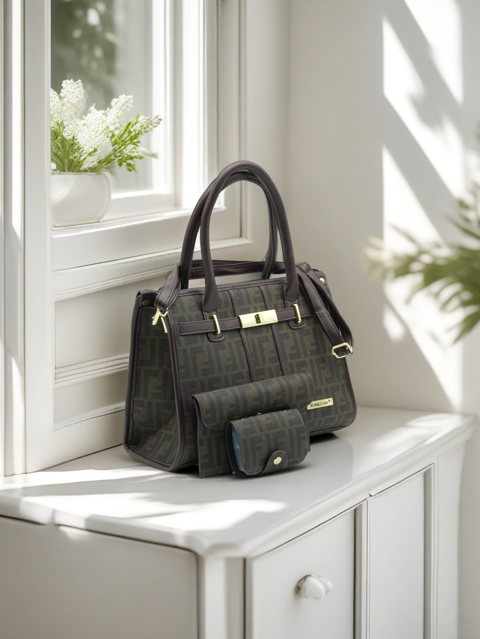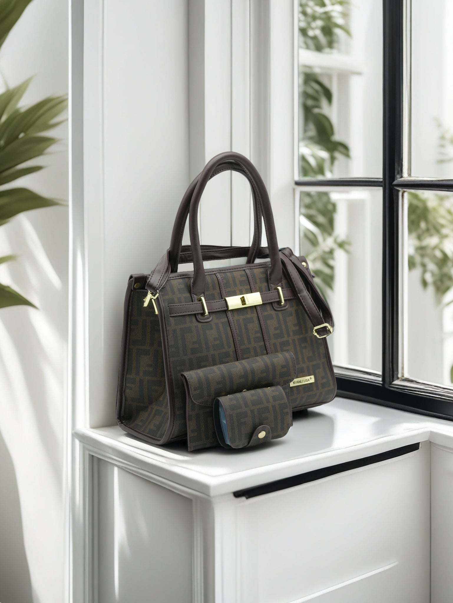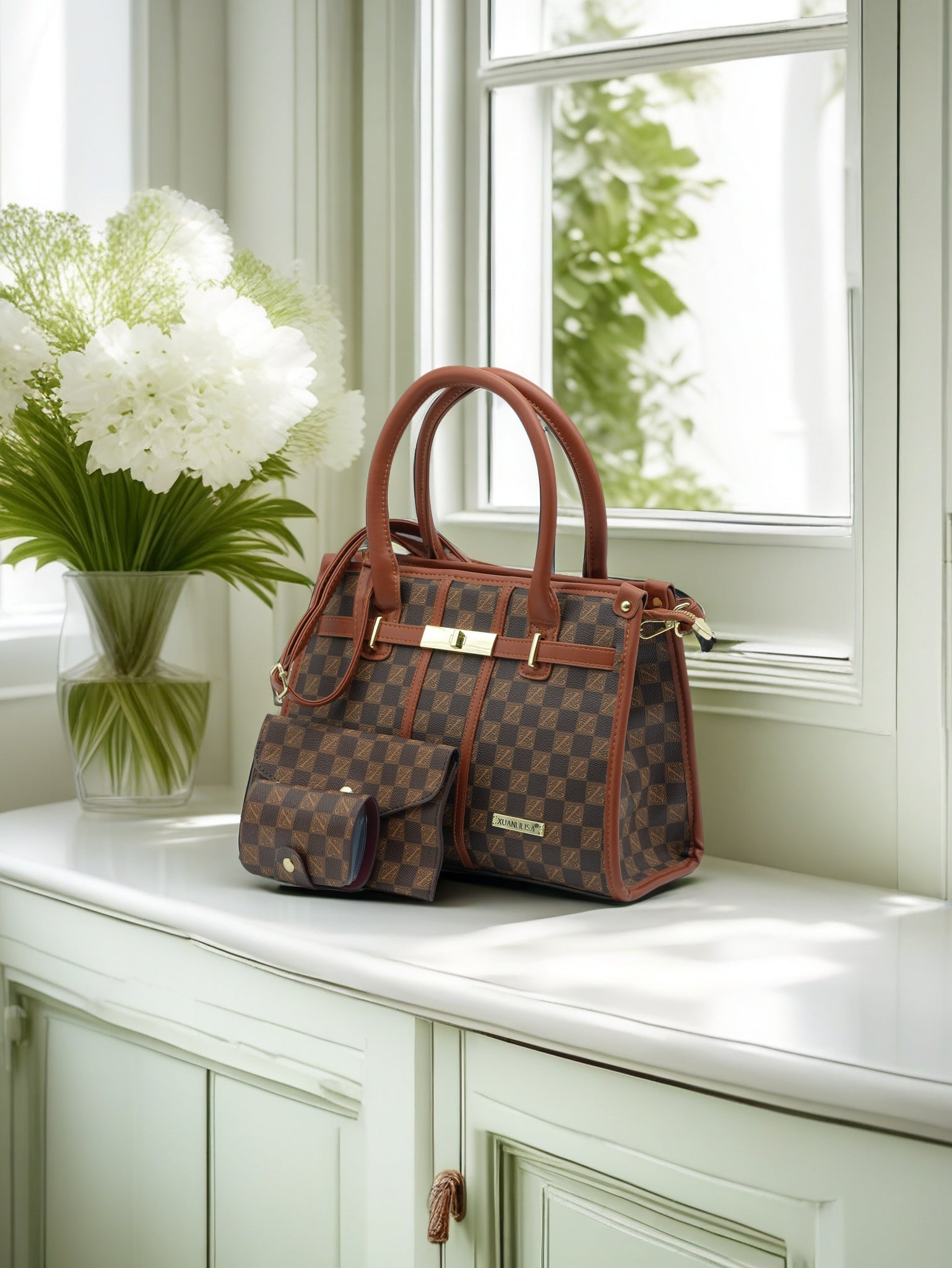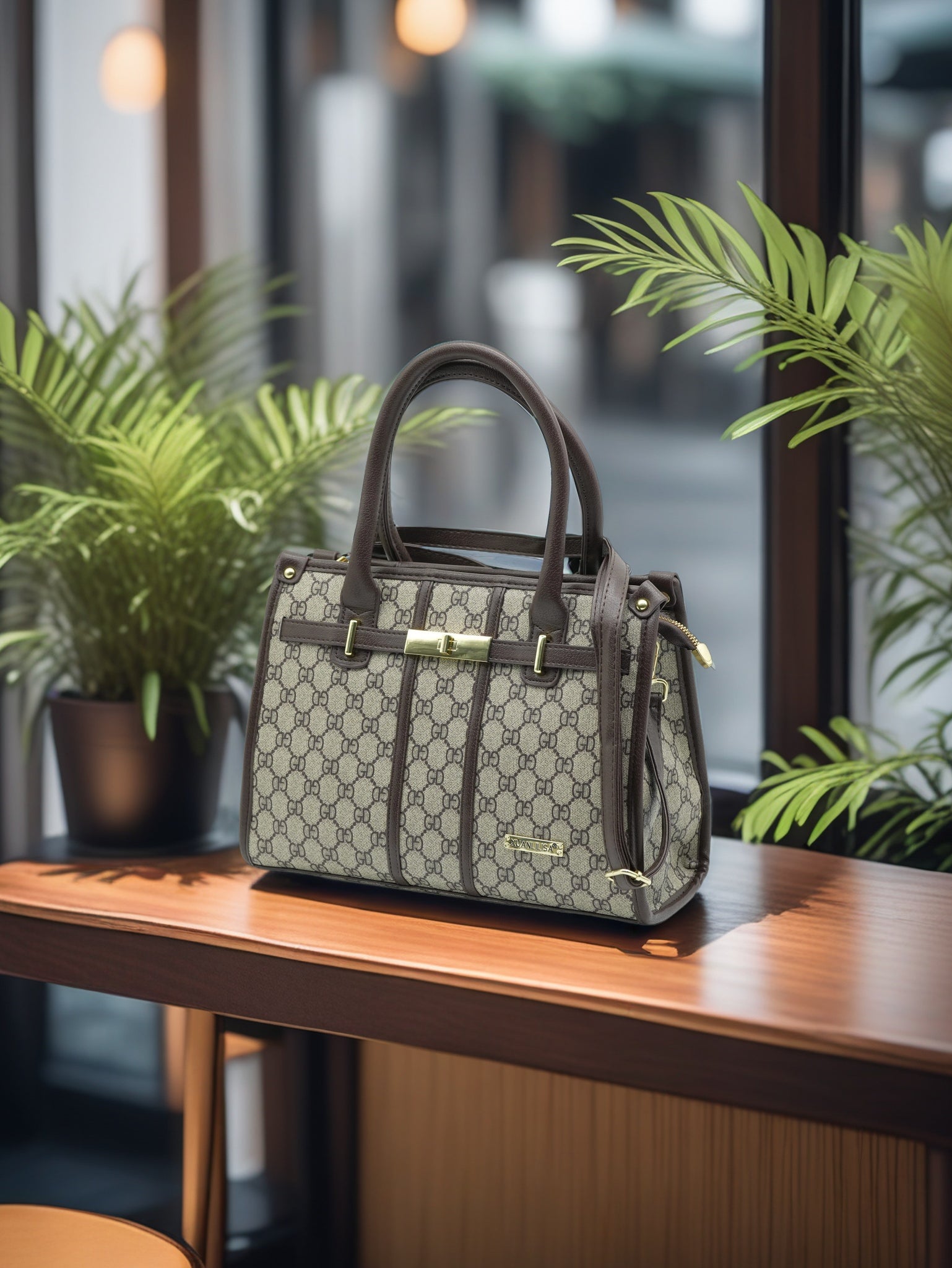 حقيبة يد نسائية بنية اللون مستوحاة من المصممين ومزينة بأحرف أولى مع قفل ذهبي ومقابض علوية