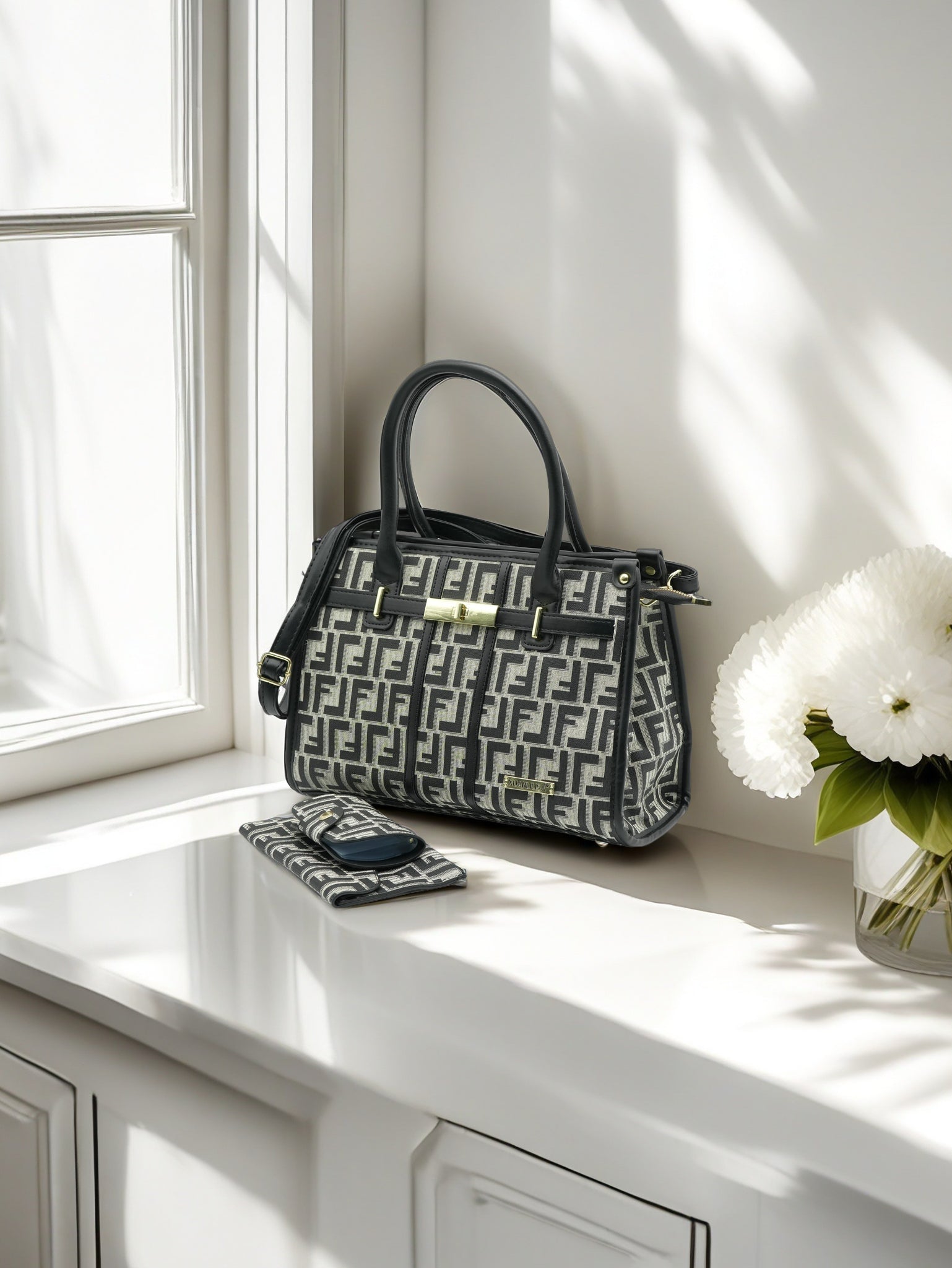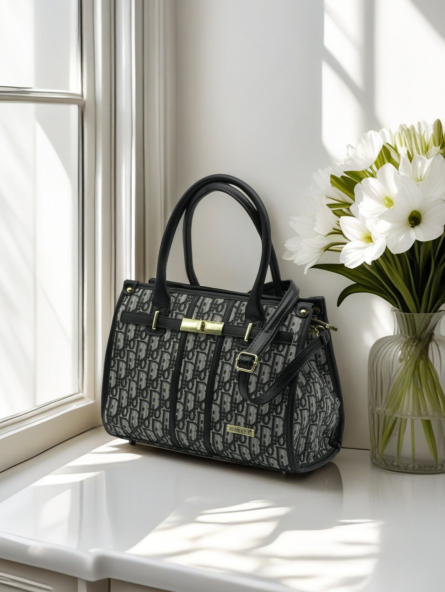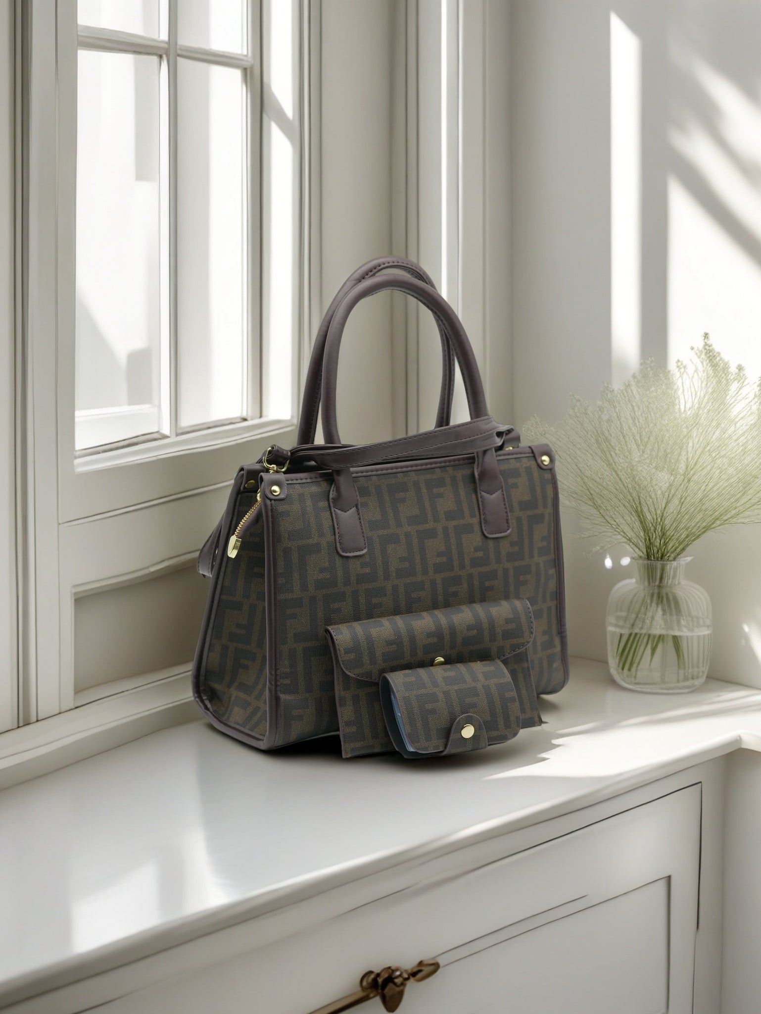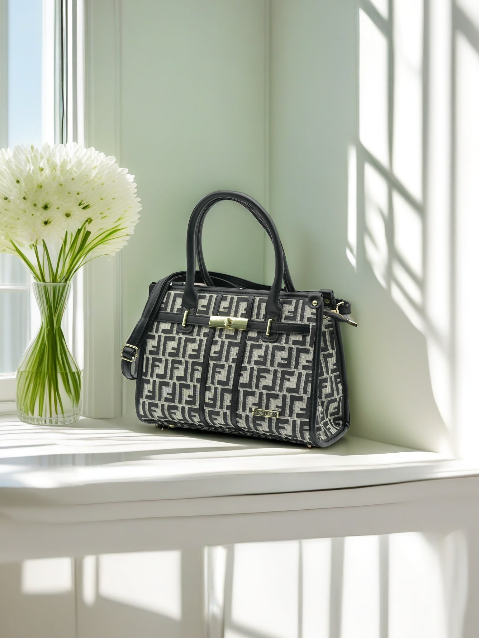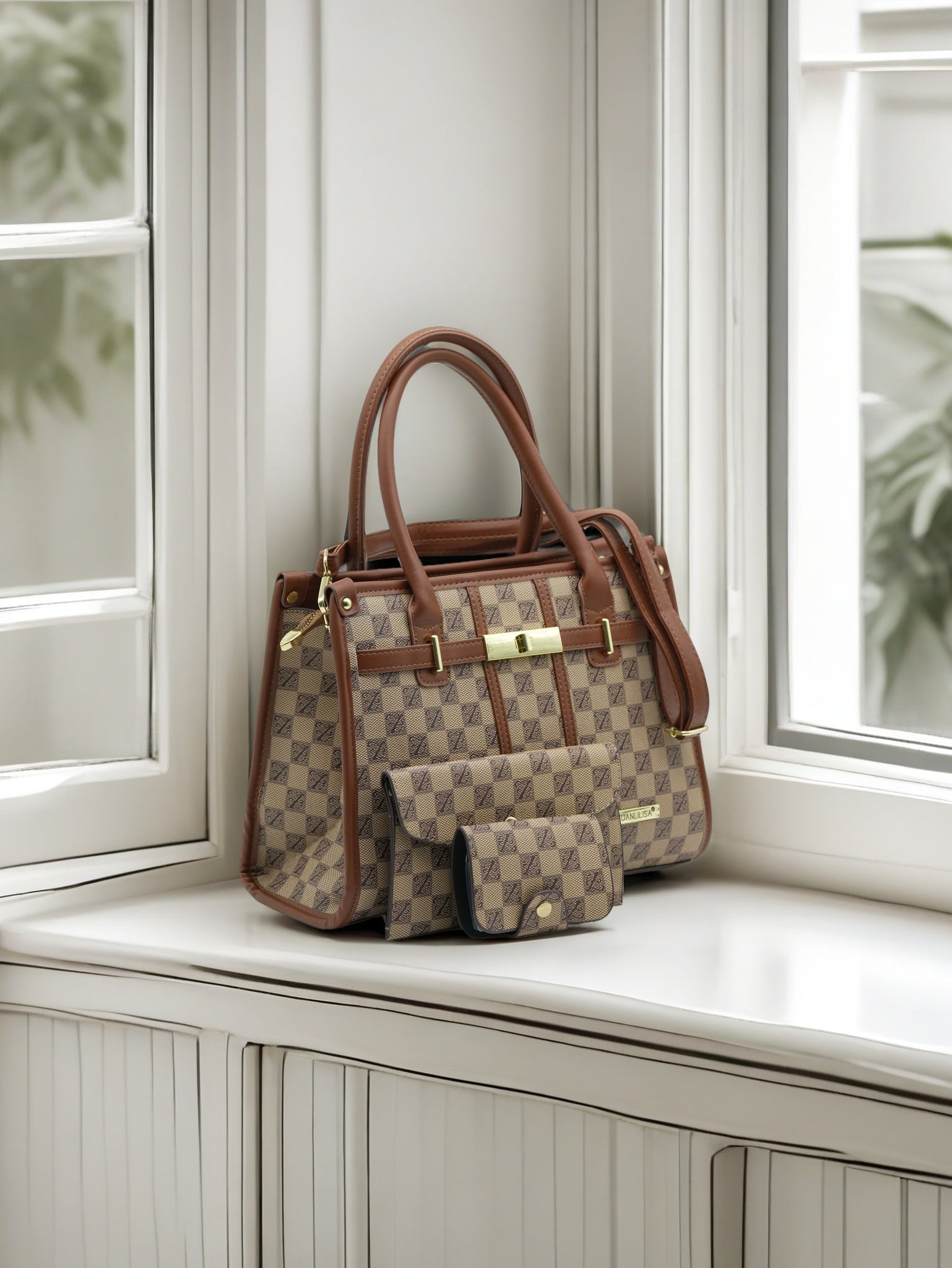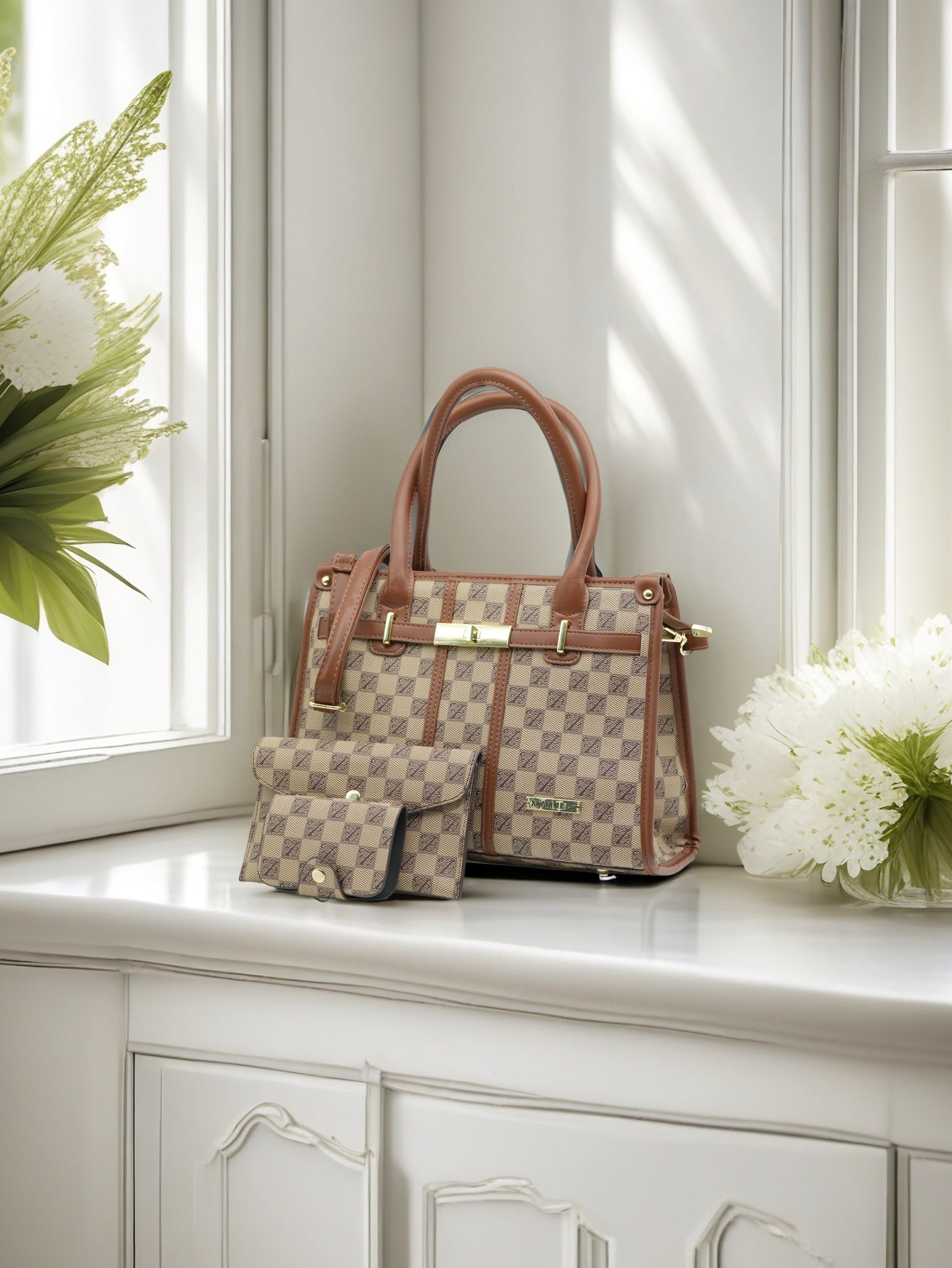 حقيبة يد نسائية بنية اللون مستوحاة من المصممين ومزينة بأحرف أولى مع قفل ذهبي ومقابض علوية