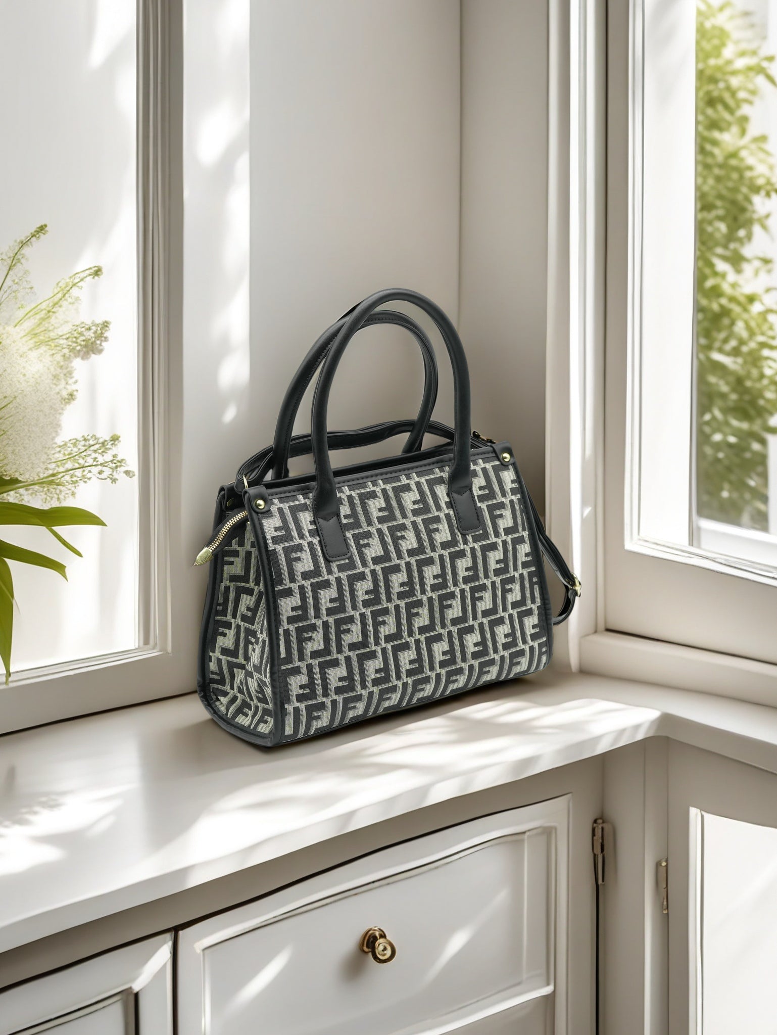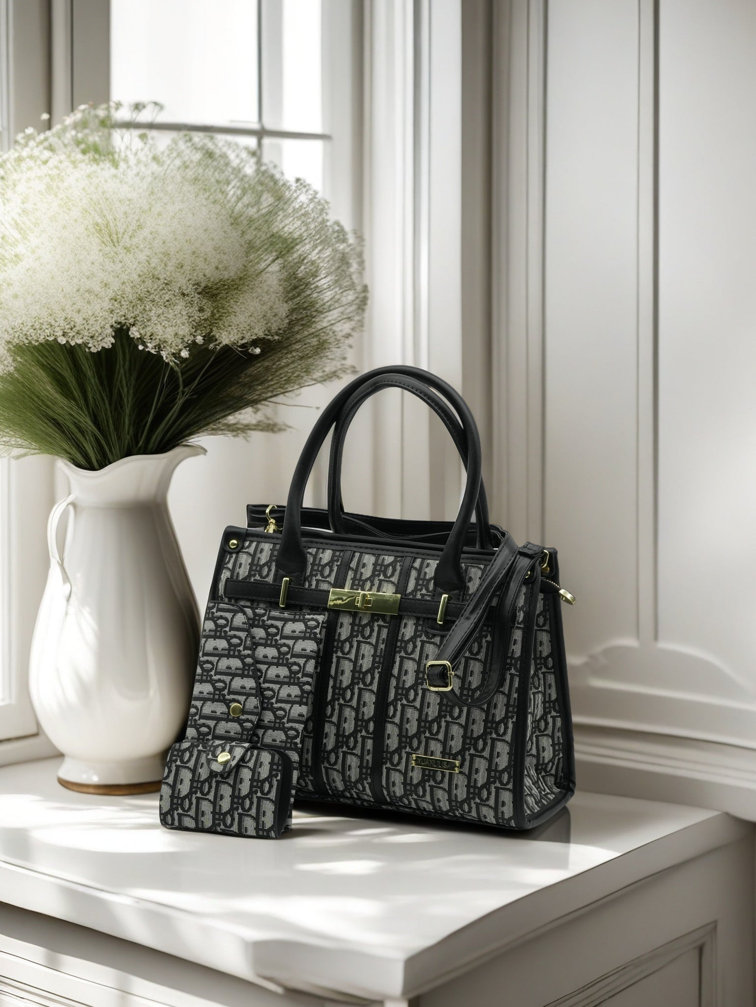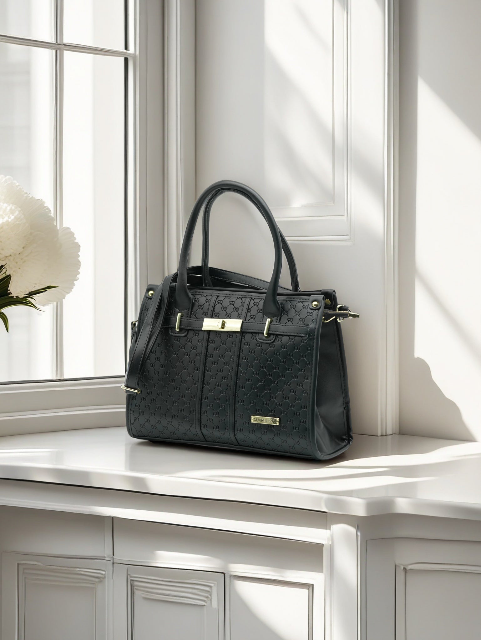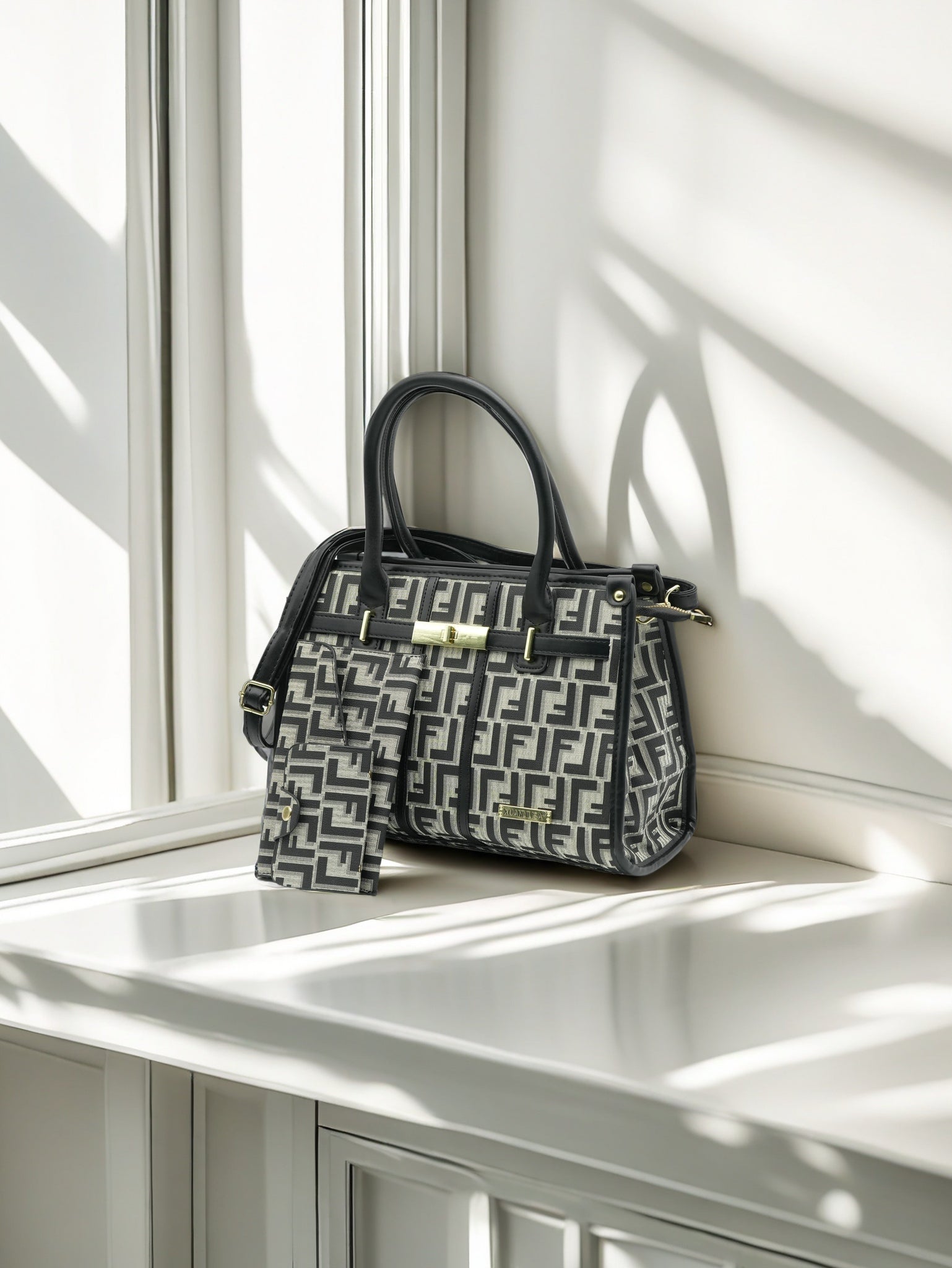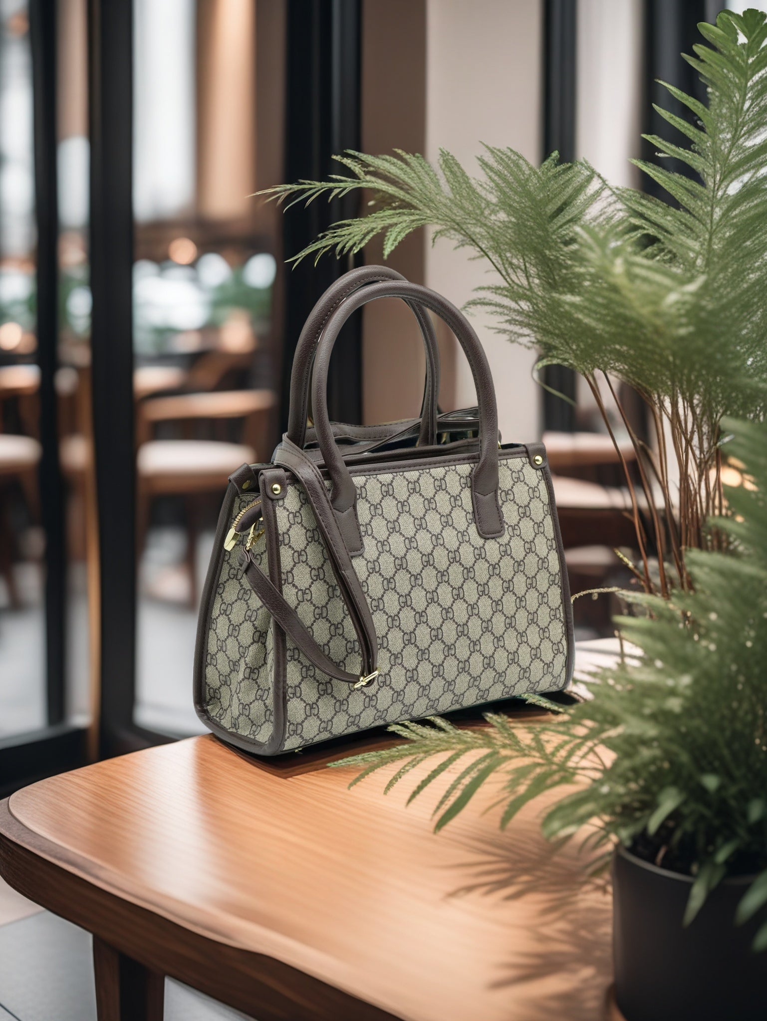 حقيبة يد نسائية بنية اللون مستوحاة من المصممين ومزينة بأحرف أولى مع قفل ذهبي ومقابض علوية