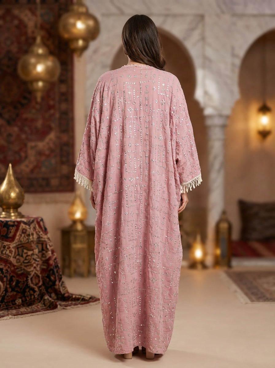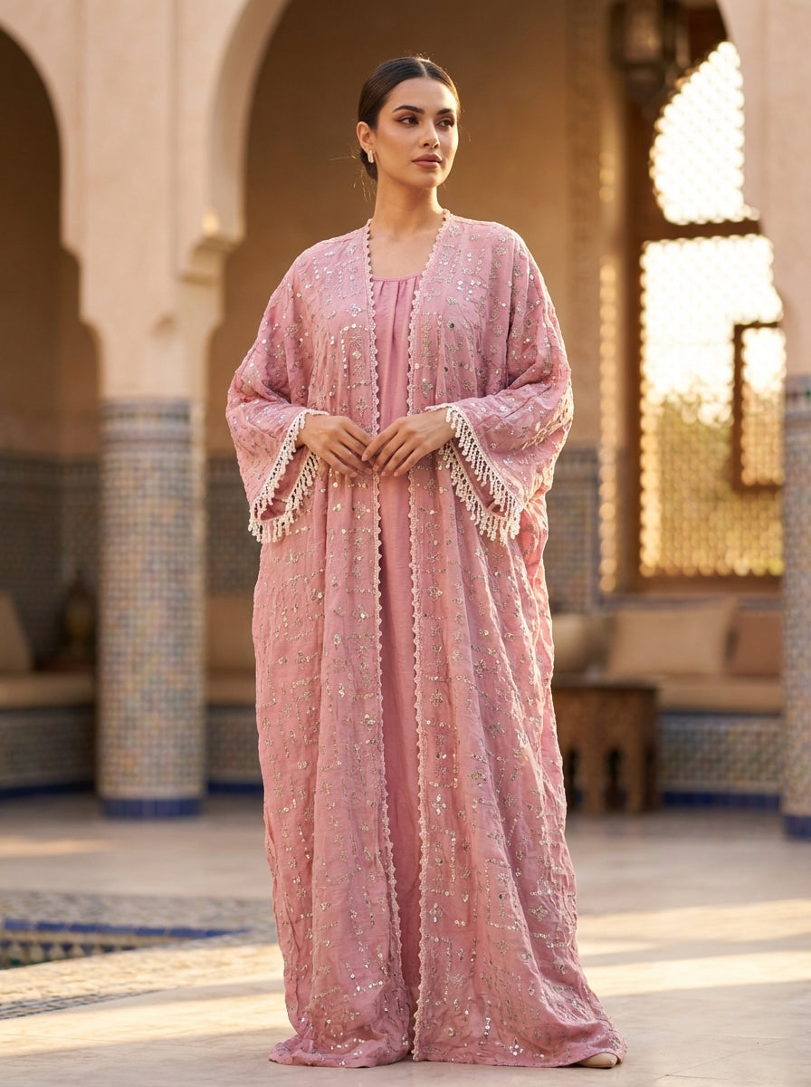 طقم عباية فاخر بلون وردي باهت مزين بتطريزات أنيقة، مع فستان داخلي. يتميز بتفاصيل ترتر أنيقة وحواف مزينة بشراشيب، وهو مثالي للعيد ورمضان والمناسبات الخاصة.