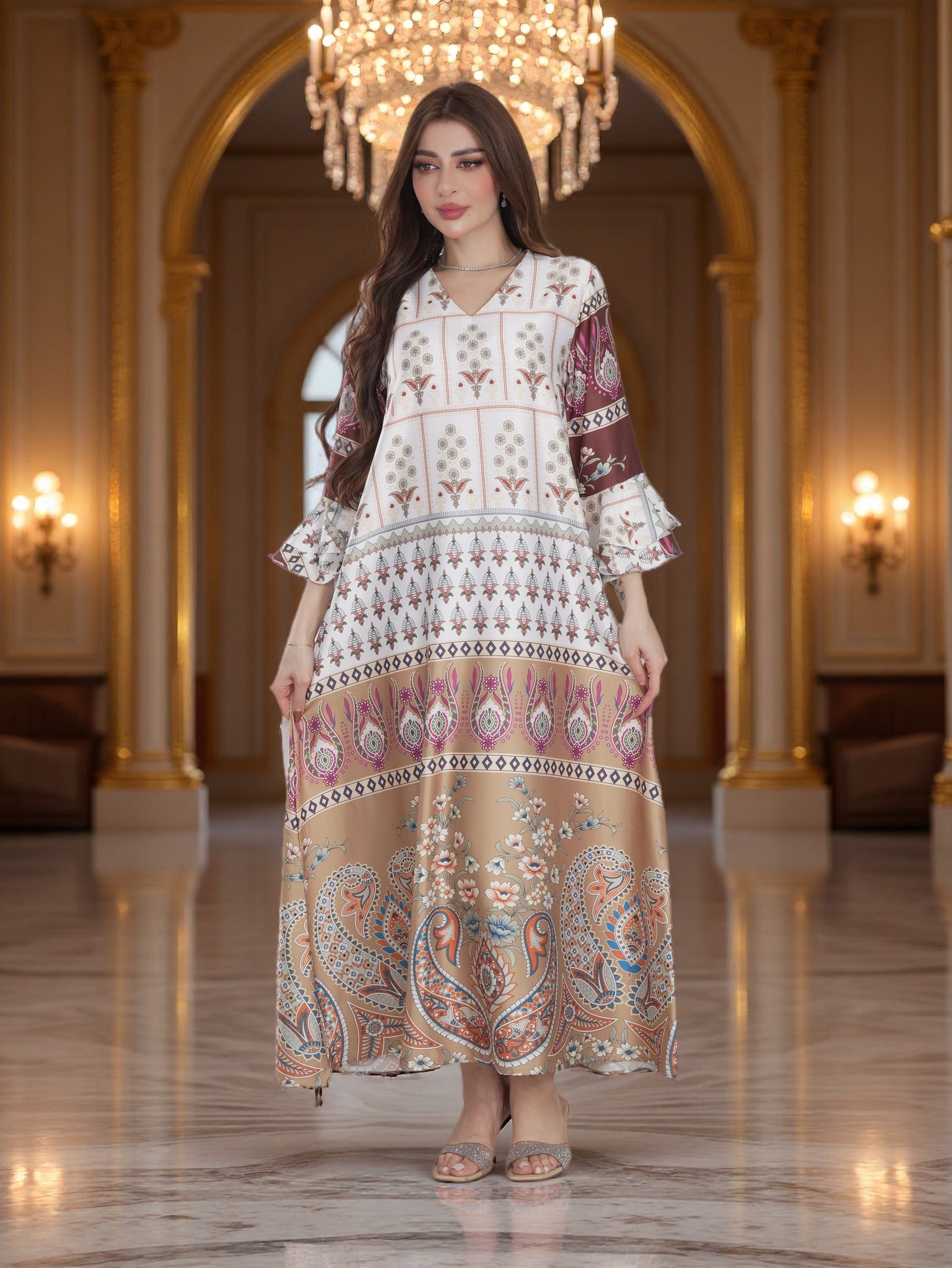 Elevate your modest wardrobe with this elegant ivory and beige heritage print dress, designed for timeless Saudi style. Featuring intricate traditional patterns with soft earthy tones, this dress blends cultural charm with modern comfort.