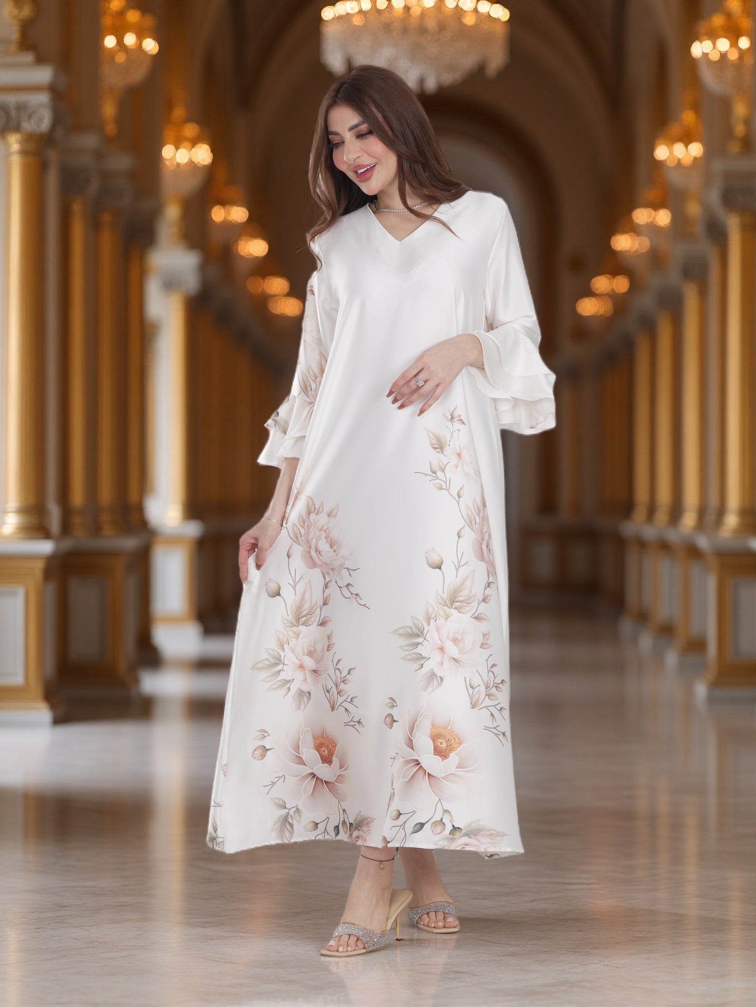 Embrace timeless elegance with this beautiful ivory modest dress, designed with soft floral prints that add a graceful and feminine touch. Crafted for women who appreciate modesty, comfort, and understated luxury, this dress fits seamlessly into the Saudi lifestyle.