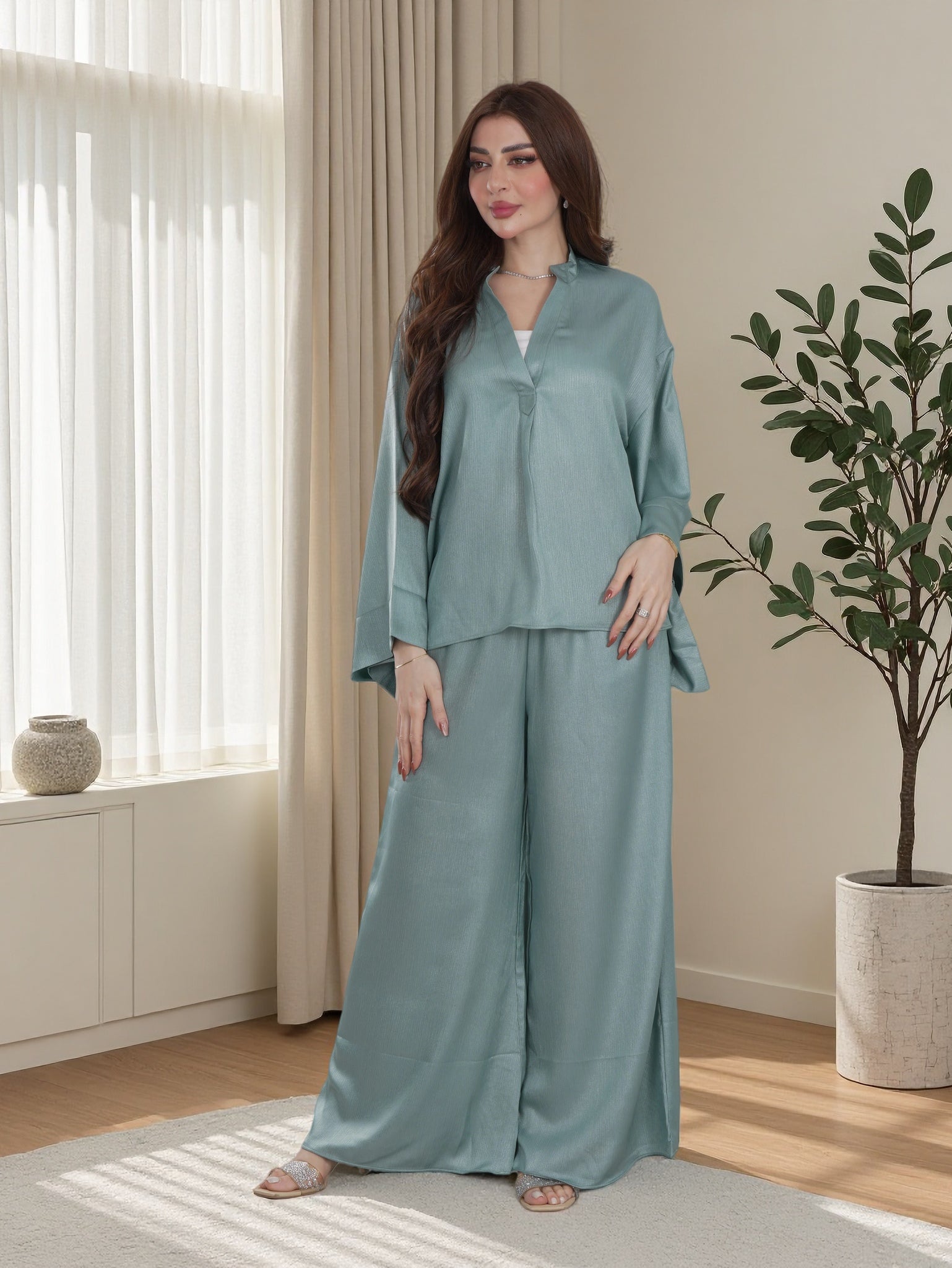 Finelook Luxe Satin Modest Two-Piece Set – Wide Sleeve Top & Palazzo Pants