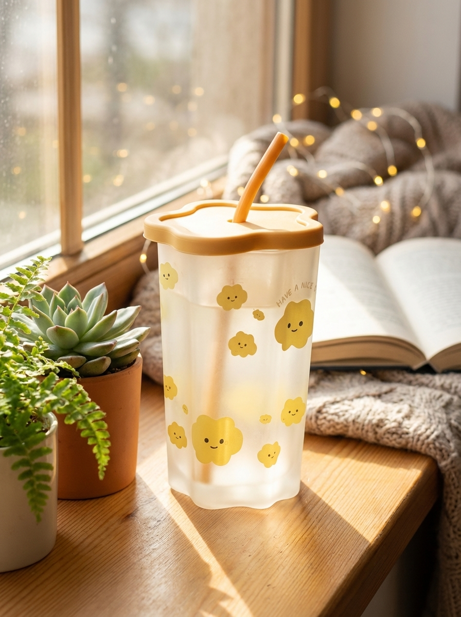 Cute glass cup with silicone lid and straw yellow cloud design aesthetic tumbler