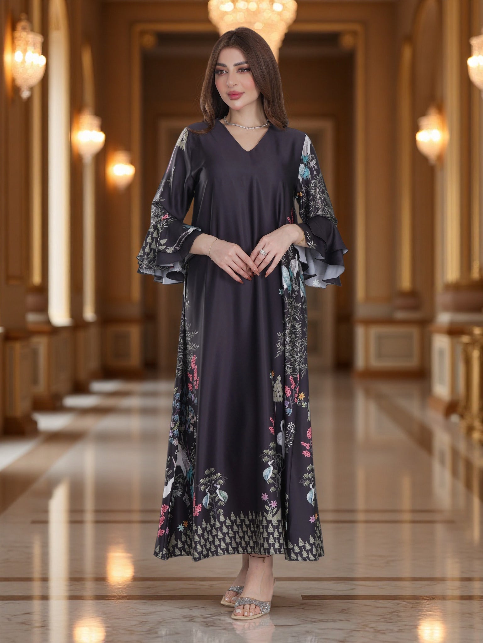 Elegant Black Botanical Printed Modest Dress with Flared Sleeves – Everyday Luxury Wear