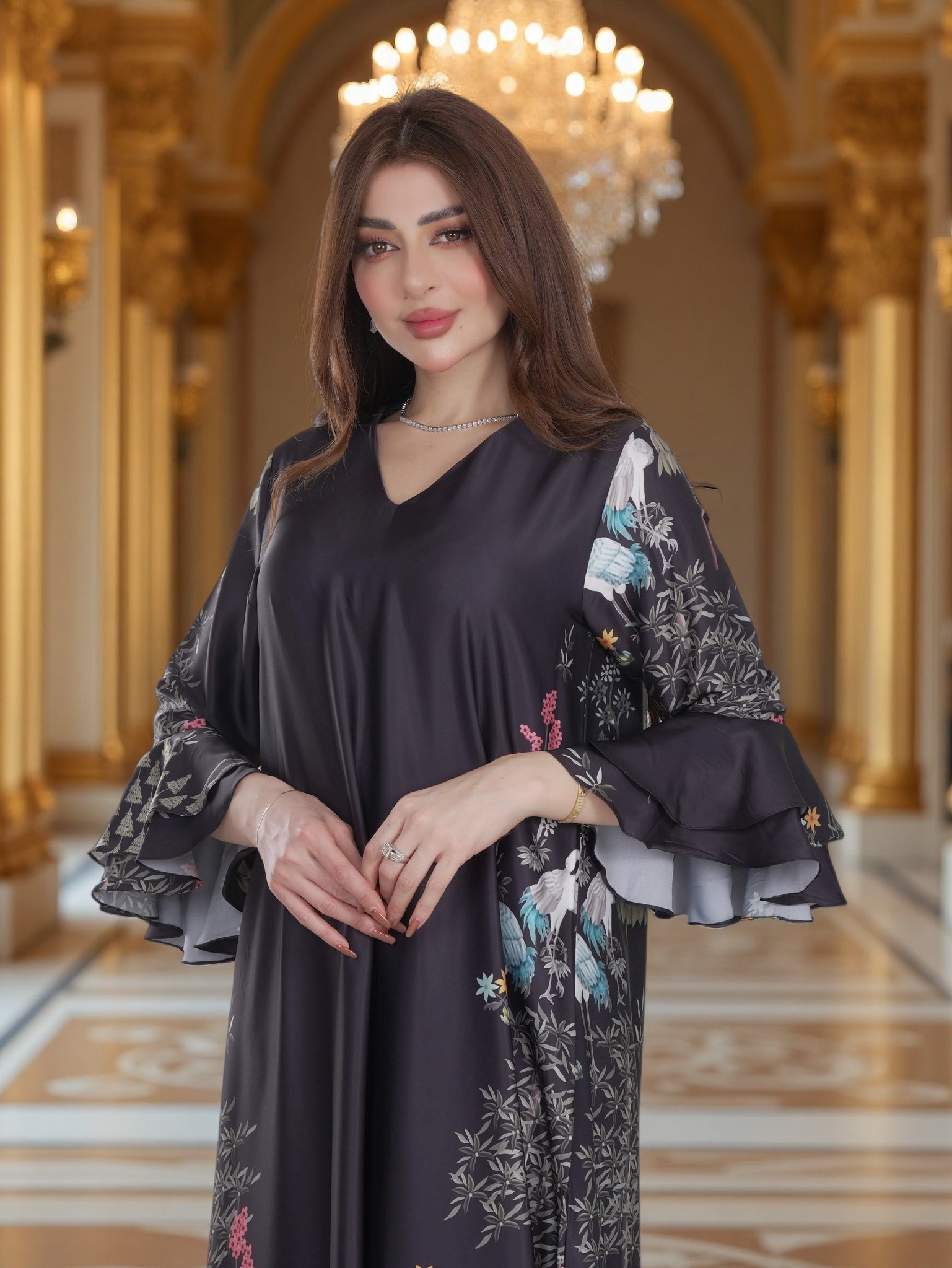 Elevate your modest wardrobe with this elegant black printed dress, designed for women who appreciate timeless style with artistic detail. Perfect for the Saudi market, this dress features a rich black base adorned with delicate botanical and bird-inspired prints, creating a sophisticated and graceful look.