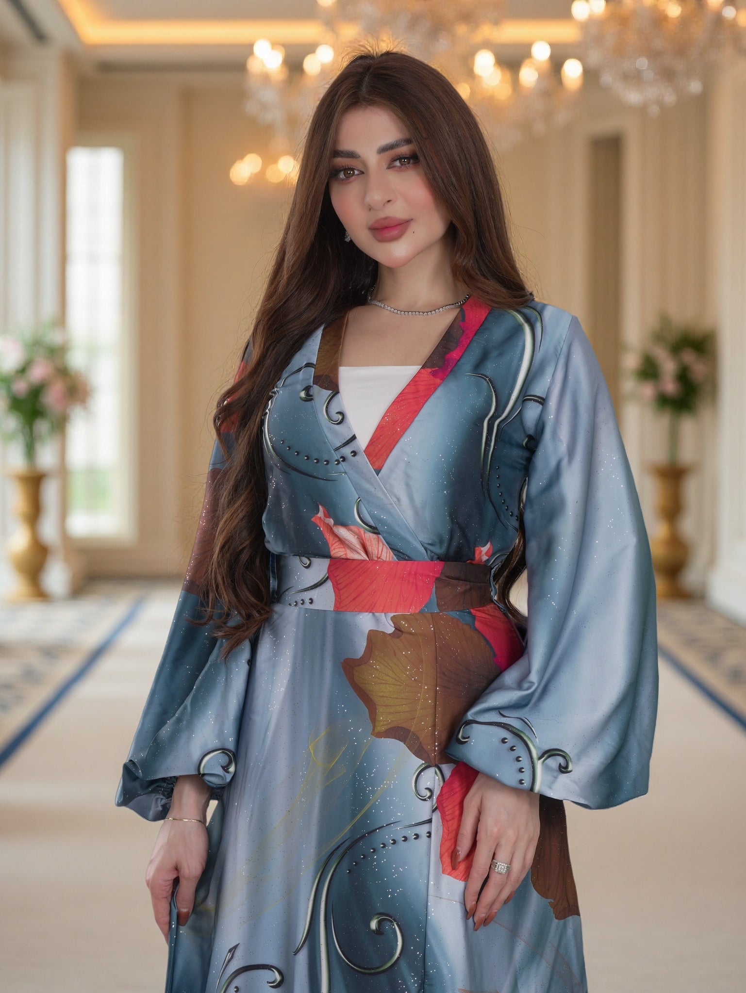 The rich blue base is enhanced with bold floral artwork in warm and vibrant tones, creating a refined yet eye-catching look. Long balloon sleeves add a touch of luxury and softness, while the lightweight, silky fabric drapes beautifully for all-day comfort.