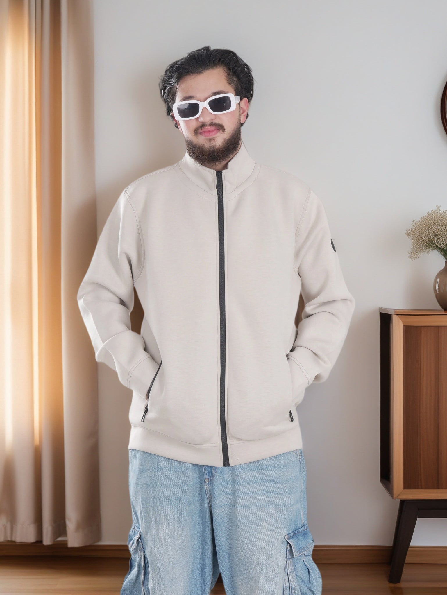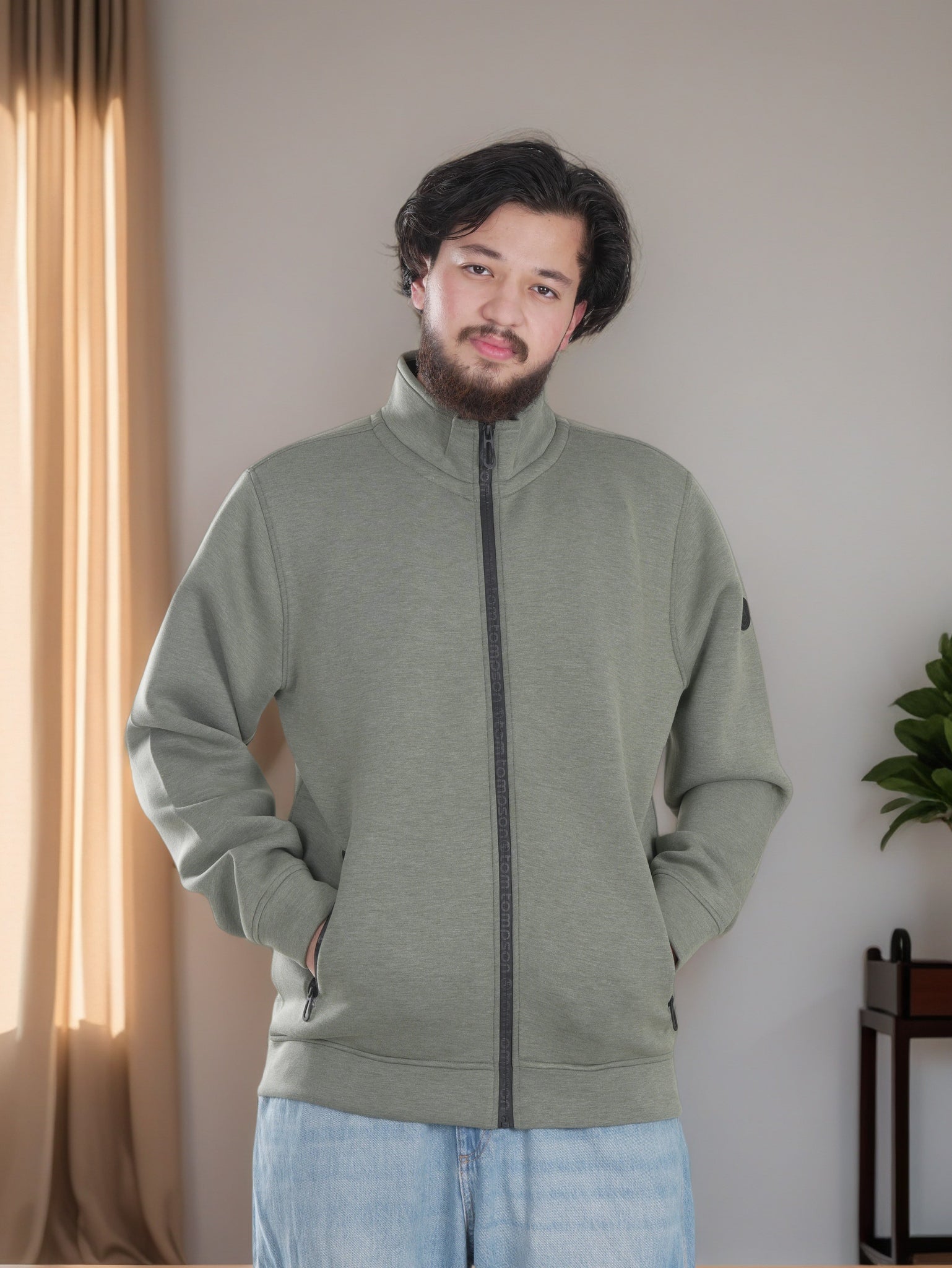 Elevate your casual wardrobe with this versatile men's high-neck polyester jacket. Crafted from 100% polyester, it delivers a soft feel with breathable construction for all-day comfort. The solid design comes in sophisticated olive green and off white, offering timeless appeal. Practical front pockets provide convenient storage, while machine washability ensures easy care. Available in sizes S to 2XL, this jacket seamlessly transitions from weekend outings to layered styling, making it an essential addition to any modern man's collection.