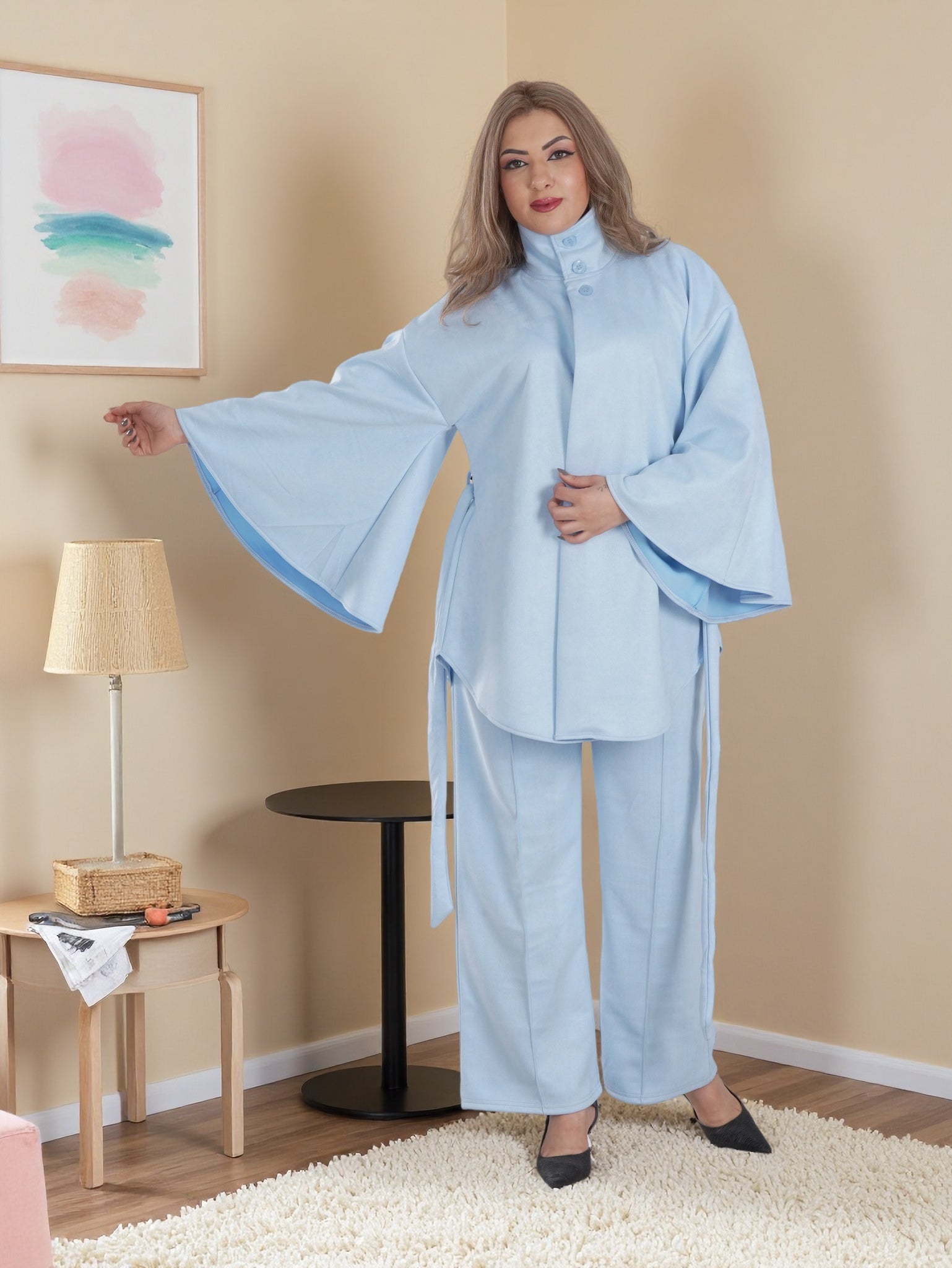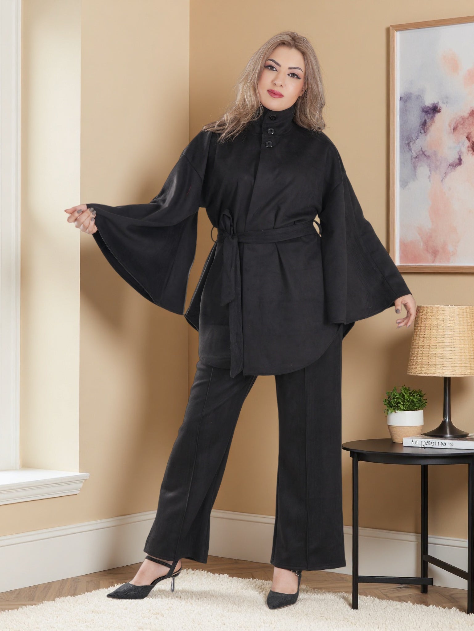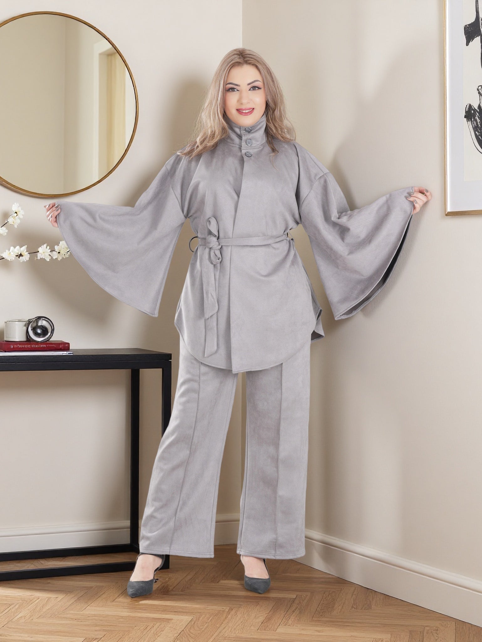 This outfit features a high-neck belted tunic with wide kimono sleeves, paired with relaxed straight-cut pants that offer a flattering fit for all body shapes.