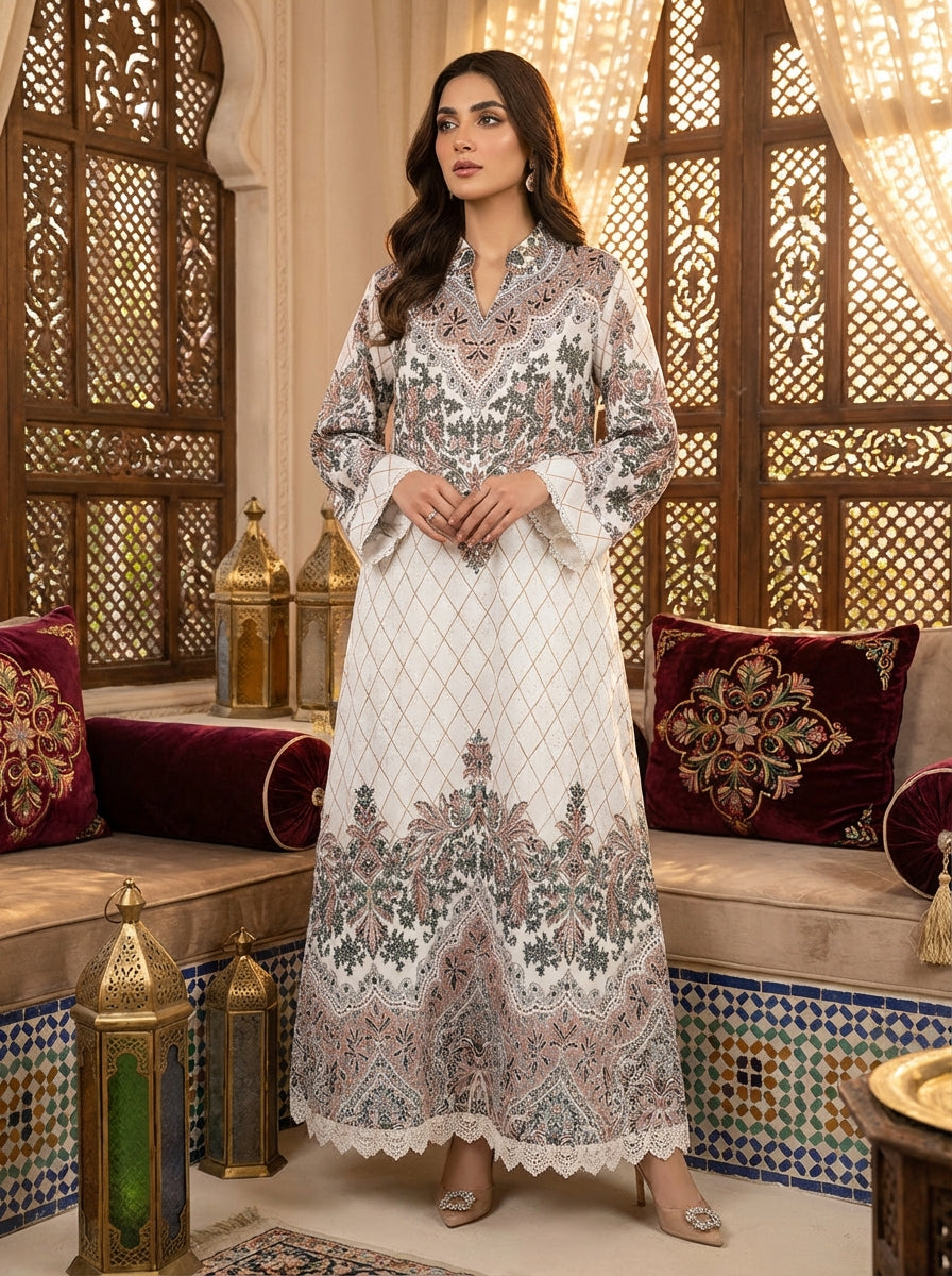 Bring timeless elegance to your wardrobe with this beautifully embroidered cream maxi dress. Designed with a relaxed flowing silhouette and intricate traditional-inspired patterns, it offers both comfort and refined style.